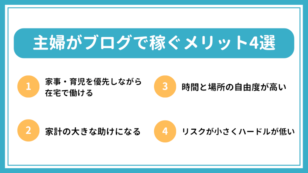 主婦がブログで稼ぐメリットとして挙げられるのは次の4つです。