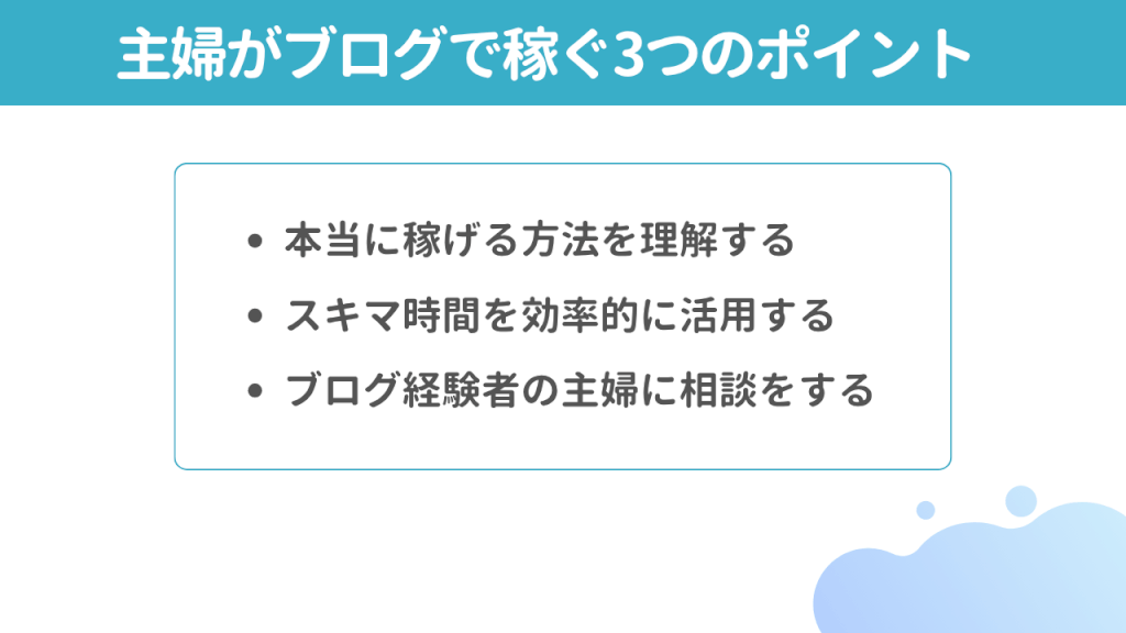 ここまで、主婦がブログで稼ぐ仕組みやメリット、ポイントを紹介しましたが、ブログで稼ぐイメージが少しできましたか?