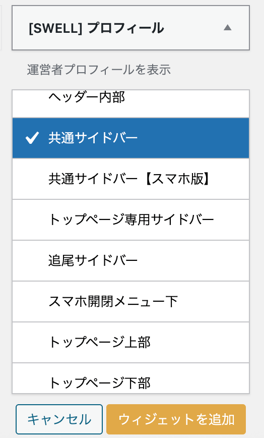 ①→②→③と押していくと【SWELL】プロフィールのウィジェットがありますので、こちらをクリックします。