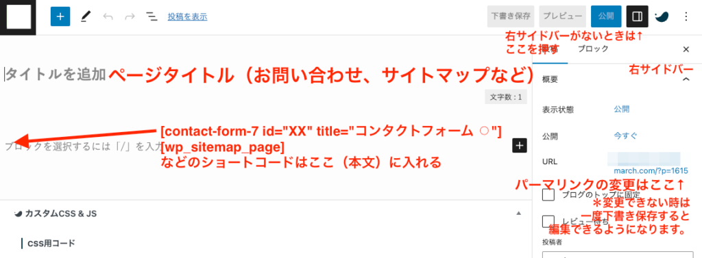 *SWELLなどのブロックエディターを使っている方は、ショートコードを入れる場所、パーマリンクの変更方法は↓をご参照ください。